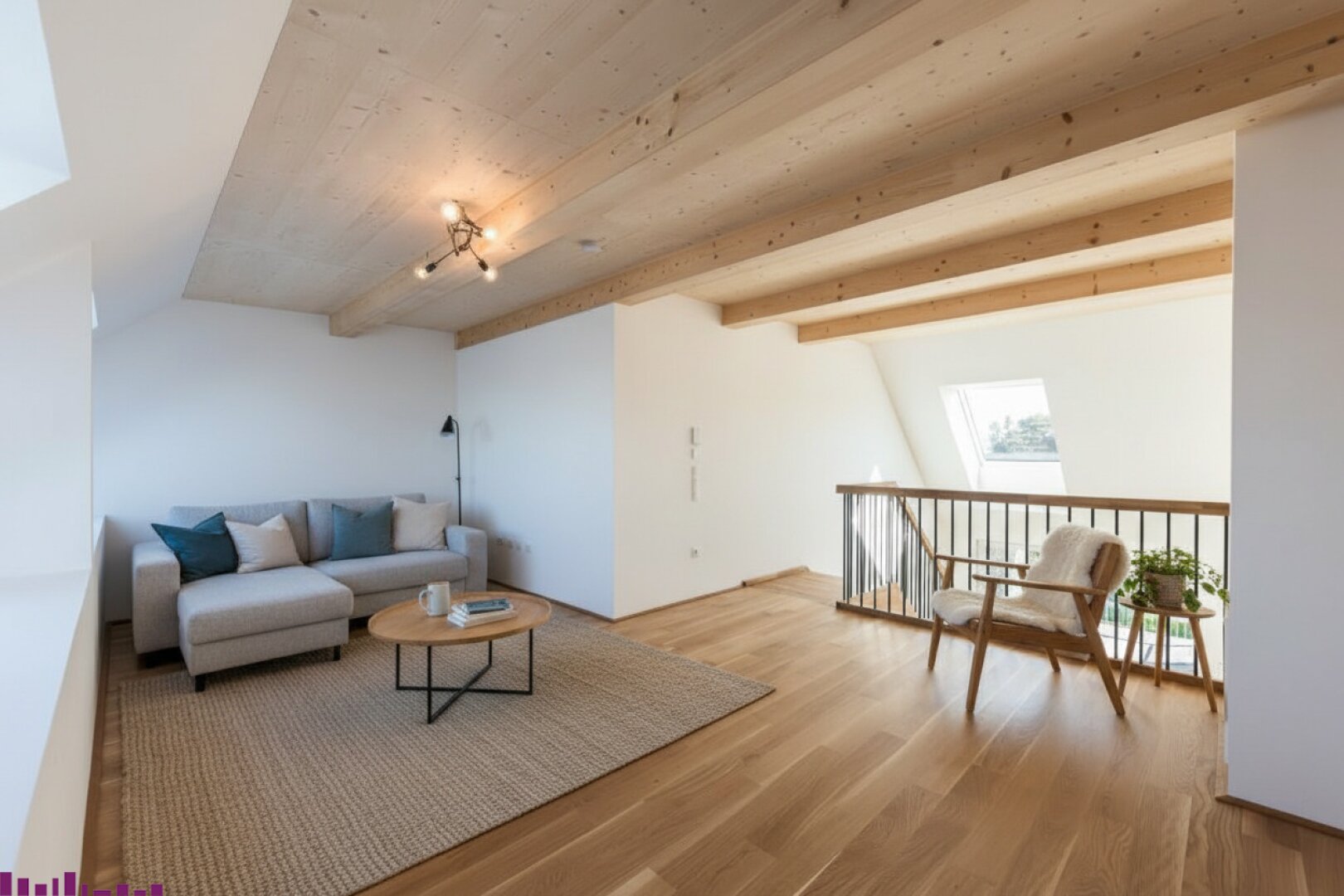 Diese lichtdurchflutete Dachgeschosswohnung mit 103,09 m² Wohnnutzfläche bietet ein offenes Raumkonzept, eine großzügige Galerie (24,50 m²) sowie einen hellen Koch-/Essbereich (21,71 m²). Zwei vielseitig nutzbare Zimmer, ein großer Vorraum (18,77 m²) mit Platz für Stauraum und Homeoffice sowie Balkon (4,54 m²) und Terrasse (11,33 m²) schaffen höchsten Wohnkomfort. Ideal für alle, die Raum, Licht und Flexibilität schätzen.